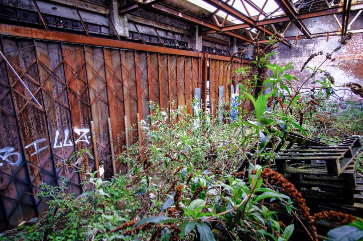 A doorway beyond floods light relief upon us and we stumble out into a huge industrial space. Sunlight pours in through the naked skeletal remains of the roof, vast apexes of rusted steel spanning the emptiness. It’s a vast, vacant expanse, filled with nothing but the breeze. It’s takes minute for my eyes to adjust and the relief of light chases those ridiculous fears away. Immediately behind the stairwell a wall full of windows gazes blank and unknowing out over the Digbeth landscape. I walk over to look out through cracks in the glass, I’m back in Snapping mode, but then I find my eyes drawn to the far corner of the room where some of the roof survives.