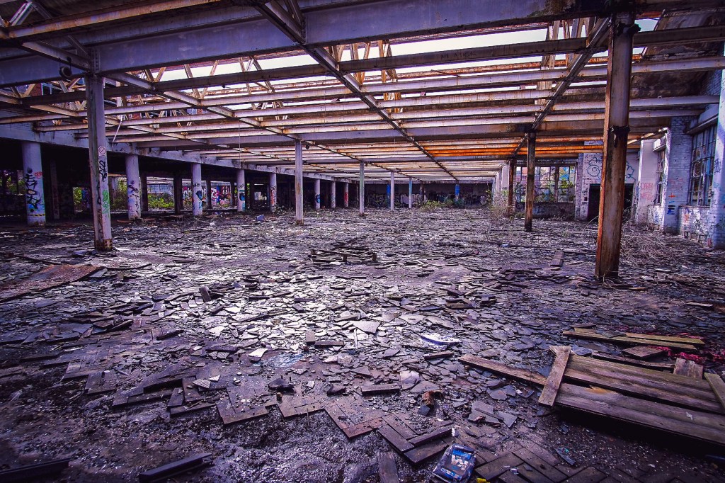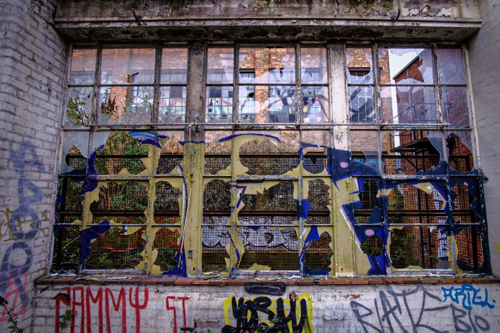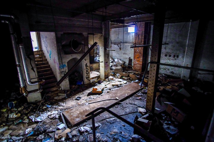 There’s parquet flooring, still intact in places, hinting at a greater whole, it must have looked wonderful in here. Now it’s crazy, diseased like leprosy, warped and bloated by moisture and time. A large oblong gap in the floor drops thirty feet to the floor below. I believe it housed the machinery for the business’s conveyor belt, moving orders to and from the delivery area beneath us (I’ve looked at old pix of the building). Now it’s just a gaping, dangerous hole, filled with broken things. It’s easy to imagine people stumbling in, blind ruined minds falling in the night. The destruction is as epic as it is dismal. Sledgehammer handles are dotted about amidst the ruinations, evidence of drug fueled throw-downs or maniacal expressions of the marginalized. Be it major or minor, our capacity for destruction is unparalleled.