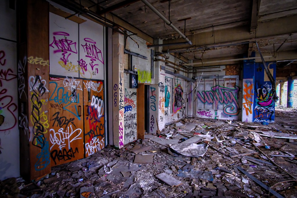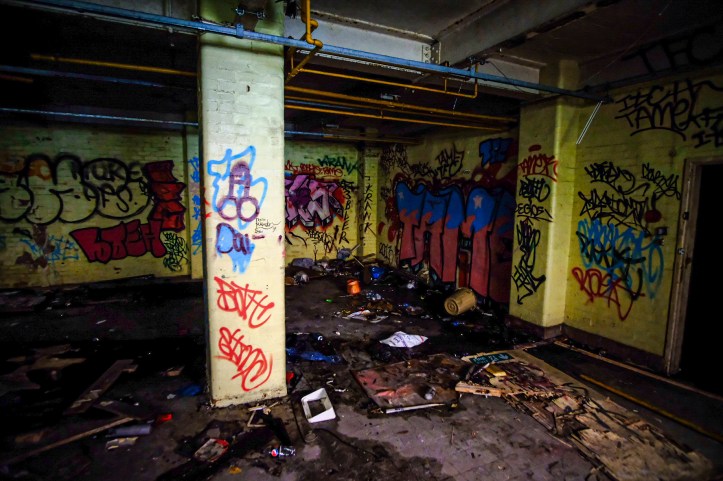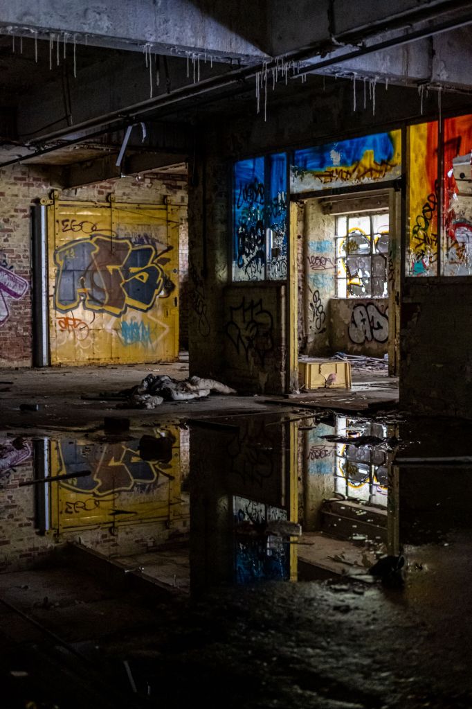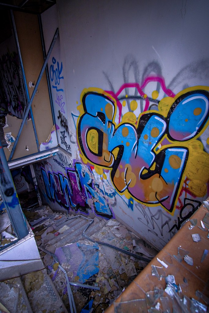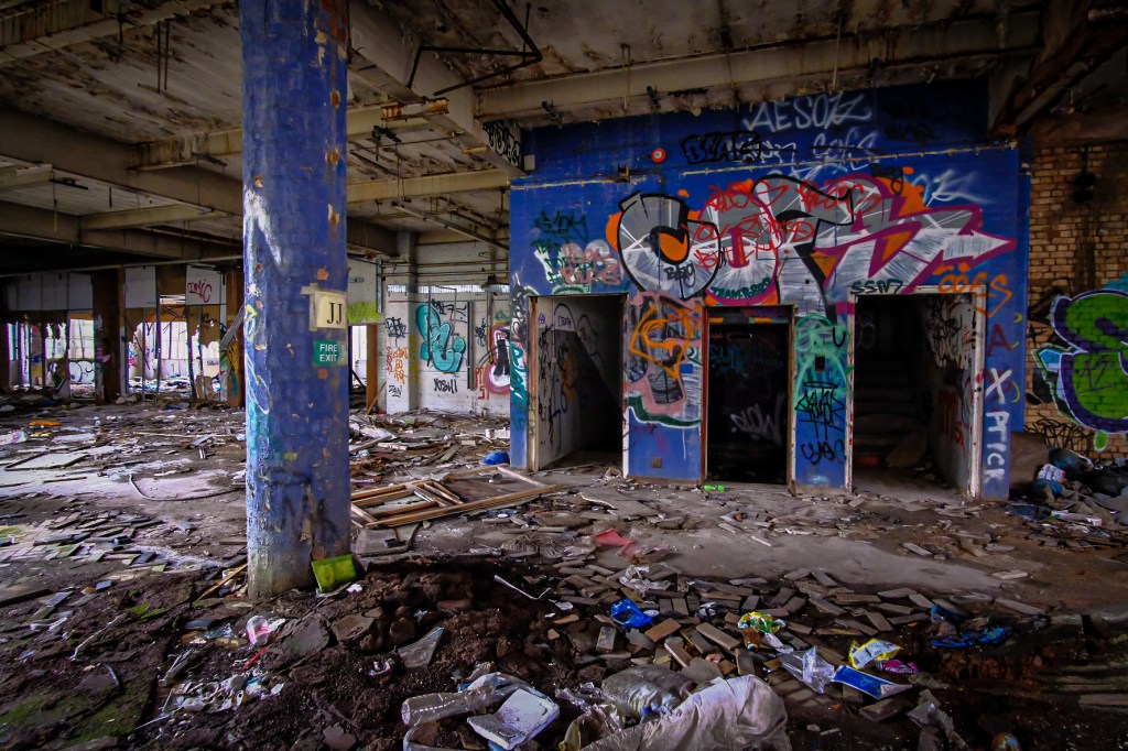 What this vast space was for I can only imagine – sorting and storing the supplies, probably in rows of metal shelving, stacks and pallets ready for picking and dispatch. The lift is big enough for a hand pushed pallet truck and an operator. It feels very familiar, despite the carnage and decay. There are signs and bits of things lying about, broken mementos that have lasted but they are few and very far between. We drift around to the far side, where more dark doorways await and exterior windows glitter dimly. Colourful graffiti offers some promise.