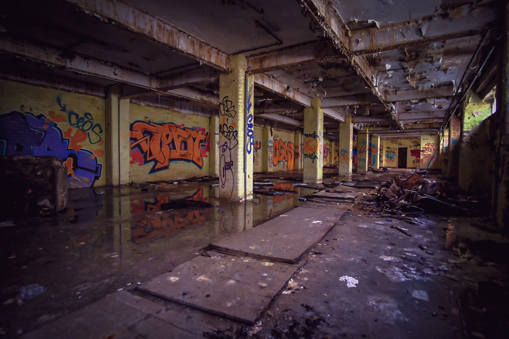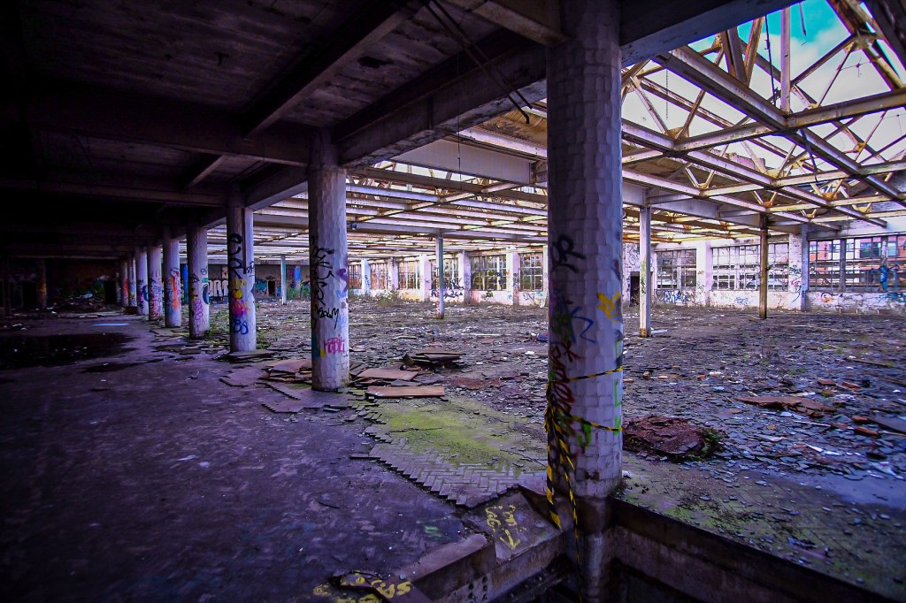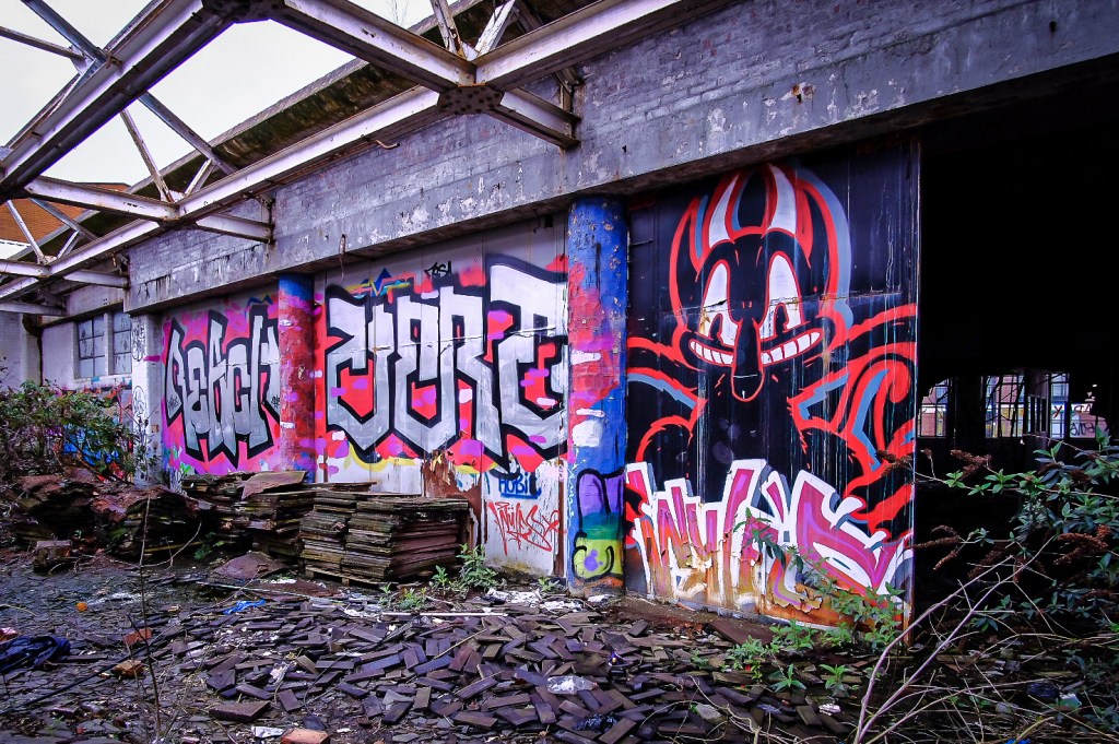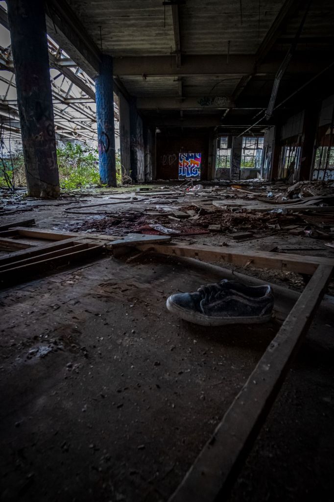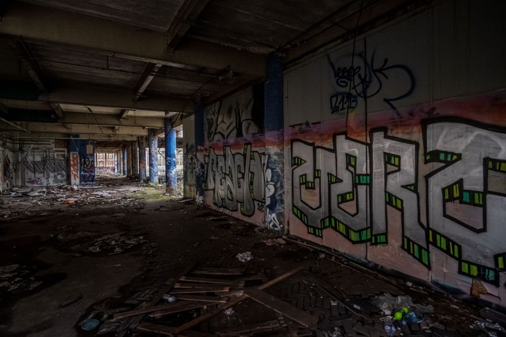 What this vast space was for I can only imagine – sorting and storing the supplies, probably in rows of metal shelving, stacks and pallets ready for picking and dispatch. The lift is big enough for a hand pushed pallet truck and an operator. It feels very familiar, despite the carnage and decay. There are signs and bits of things lying about, broken mementos that have lasted but they are few and very far between. We drift around to the far side, where more dark doorways await and exterior windows glitter dimly. Colourful graffiti offers some promise.