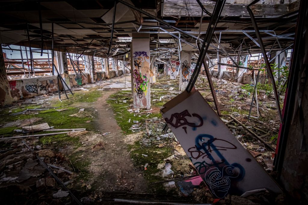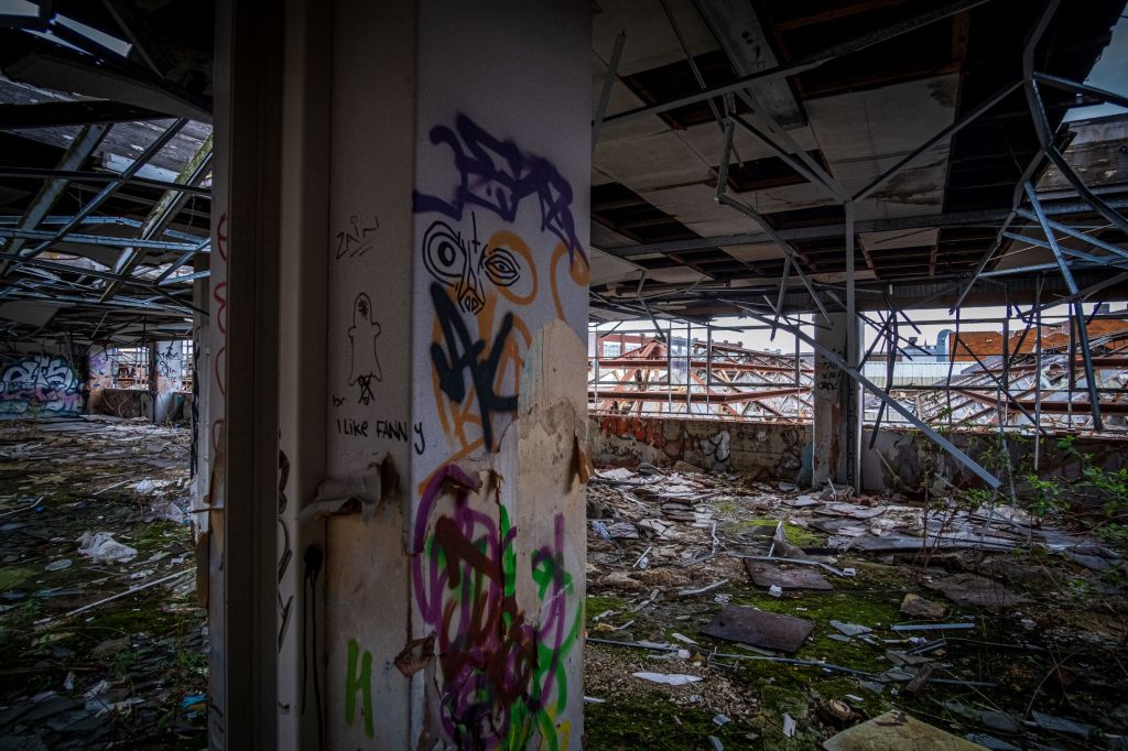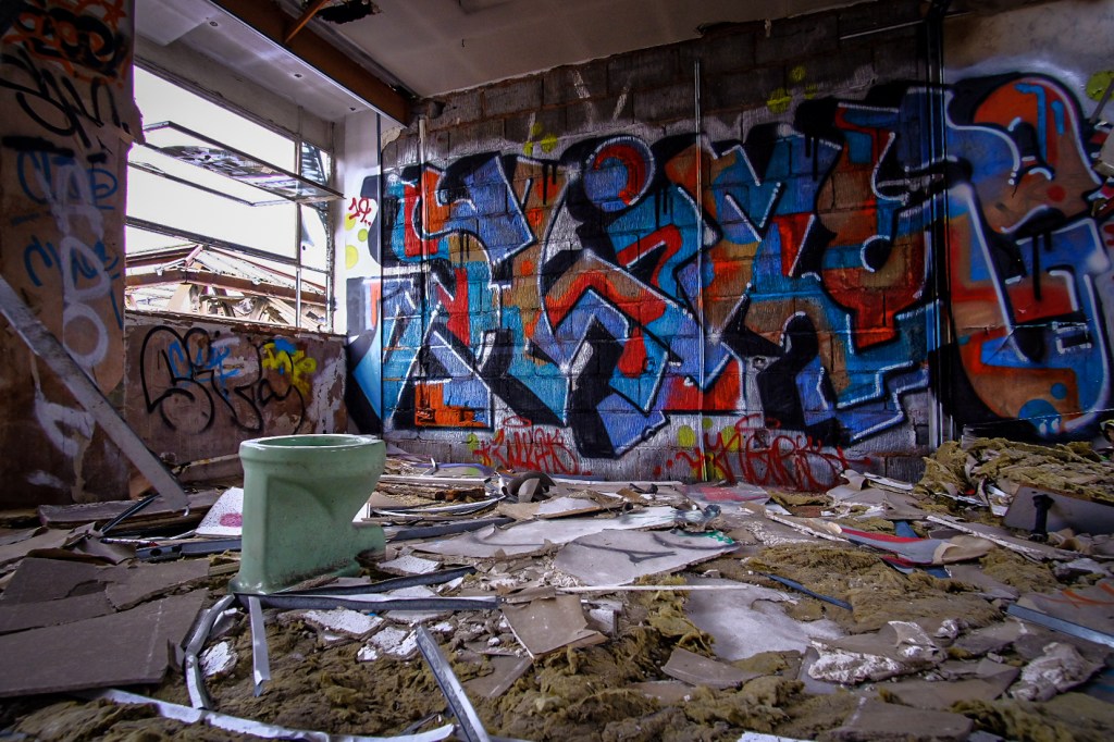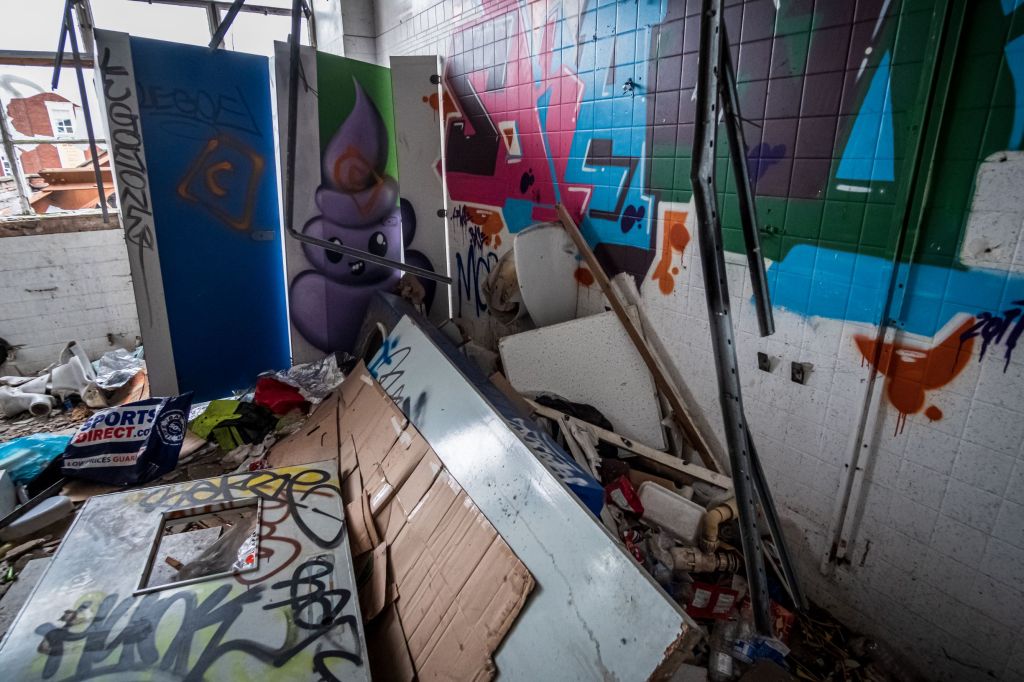 After the thrills of the lower floors, arriving at the top feels a little anti-climactic. It’s a bit like going to the seaside and realizing it’s November. These offices would perhaps have been interesting before all the destruction, now there’s nothing of the original infrastructure, except piles upon piles of plaster debris. At the far end of the space there’s a toilet block, someone has sprayed up a Poo emoji on a wonky cubicle. Classic.