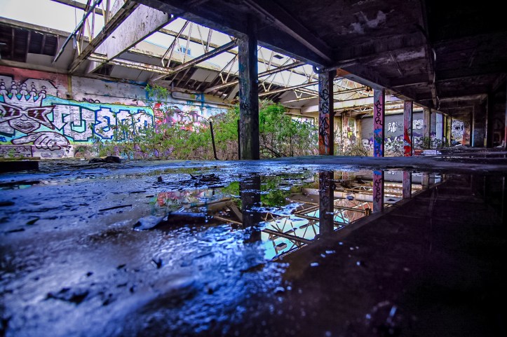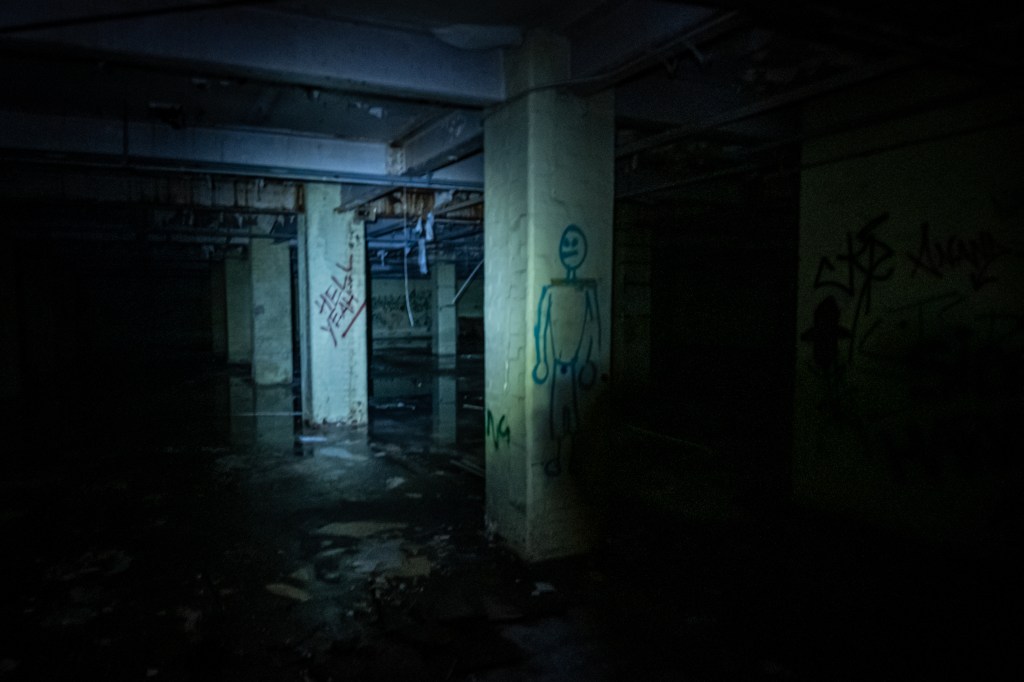 We’re snapping photos of course as we creep cautiously through the moistening gloom. Beyond a wall of broken glass a vast darkness awaits, deep and wet like a well. Brick pillars painted white, punctuate the darkness like vitiliginous ghosts holding up the roof of the Underworld. It would have been very very easy to turn around and walk out, the space here is immensely deep and full of unknowns. Your mind plays tricks on you in places like this, fears growing large in the dark. Uneasiness settles like a shroud. It’s wise to mistrust in here.