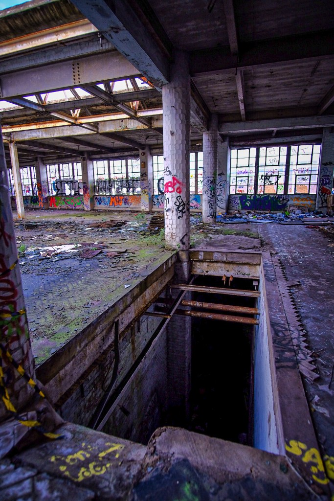 Wali and I drifted around this huge space, both of us barely speaking, concentrating on where we’re putting our feet. The external windows are mostly smashed, those that aren’t are covered in graffiti. I confess I love windows like this, utilitarian and completely uniform in appearance, yet en masse in an industrial building they’re just absolutely right. The light in here must have been amazing when the sun was out. Wali spots the opening for the freight lift in a corner, it looks like a square cave full of rust. He mutters stuff and nonsense about it probably not being safe, then promptly goes into it and voila, nothing happens. No plummeting to his doom today.