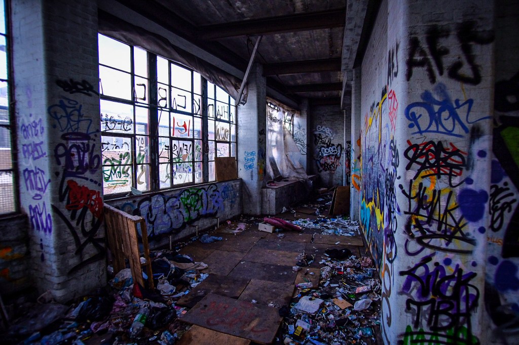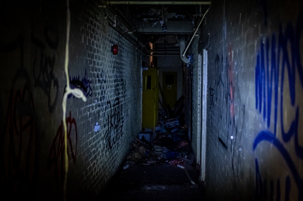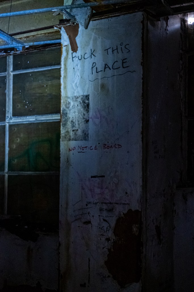 I found out after visiting this place that the fire door had been torn off by the emergency services trying to access the building during a recent fire. A Homeless man died despite desperate attempts to reach him. It’s not the first fire here, one in 2014 gutted much of the back-end of building where Wali and I entered. The place has a sepulchral atmosphere, urban necrosis.