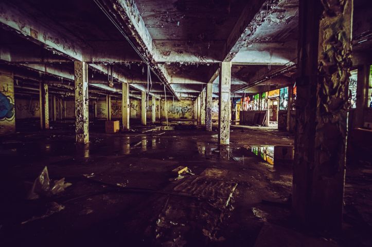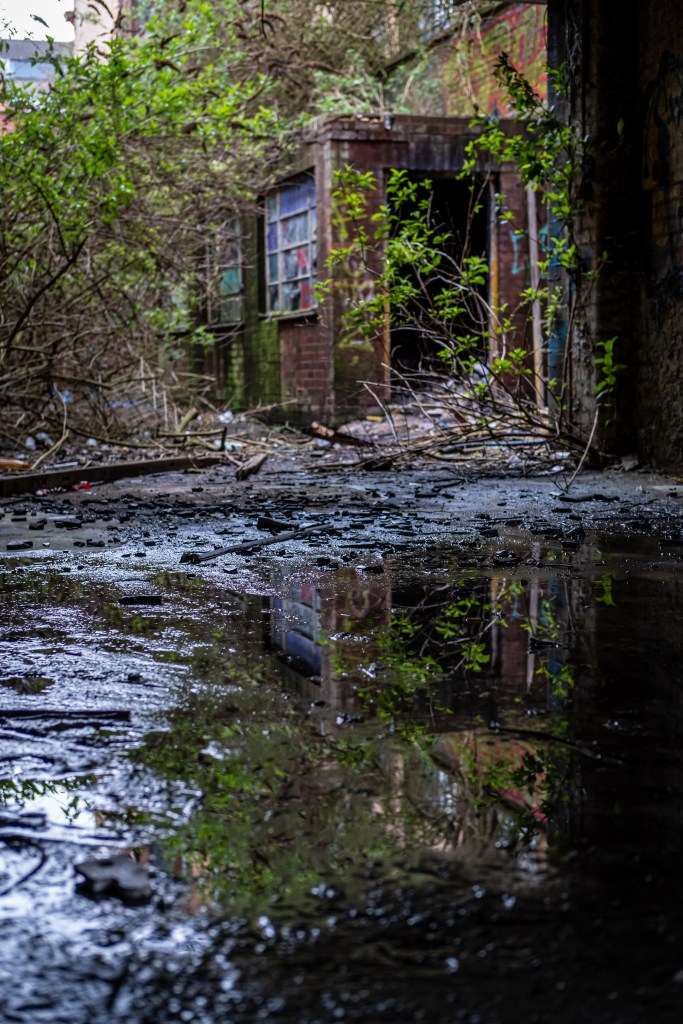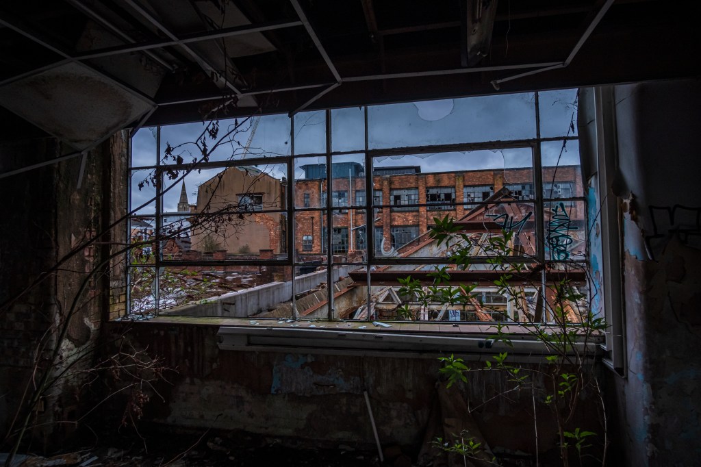 The sudden quiet is punctuated by liquid sounds from the gloomy depths behind what I guess were office windows. Pools of water plop and the drops echo like memories of Wookie Hole, limestone stalactites dangle their lifeless fingers, squeezed through from the ceilings above, evidence that the roof-seals disappeared a long time. Our feet alternately plash and crunch through water and glass, it’s oddly satisfying in the gloom. A pigeon is hooting, distorted by distance, somewhere in the building above us. It sounds corrupted and wrong, like malice aforethought.
