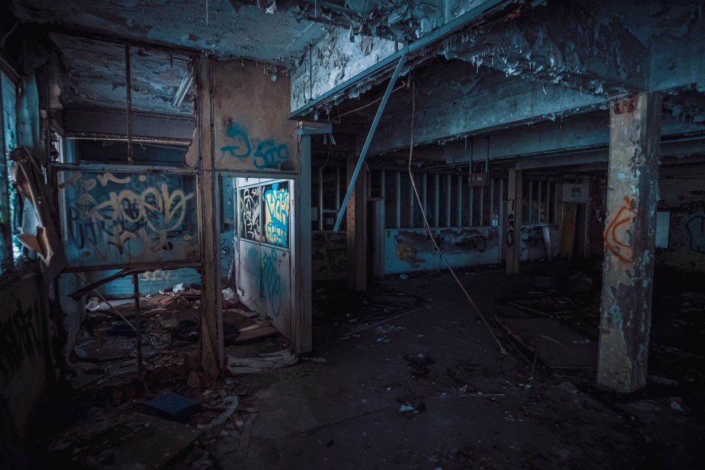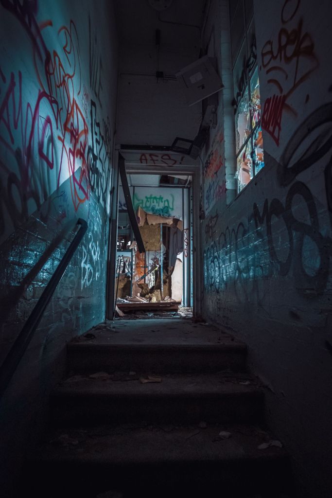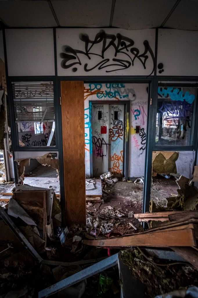 I know there’s a way up out of this dark basement, so we re-trace our route through the shadowy basement. My fumbling in the dark leads us through a broken door along a corridor of offices with glass doors painted blind to the darkness. The office doors look like they’ve been kicked at from the inside, hemorrhaging internally, we’re not tempted and enter none of these rooms. It’s a no-brainer, there maybe zombies inside, eeek! Part of me is really enjoying the thrill of the explore, marvelling at how decrepit this place is, another part is a bit unnerved and dreading the undead.