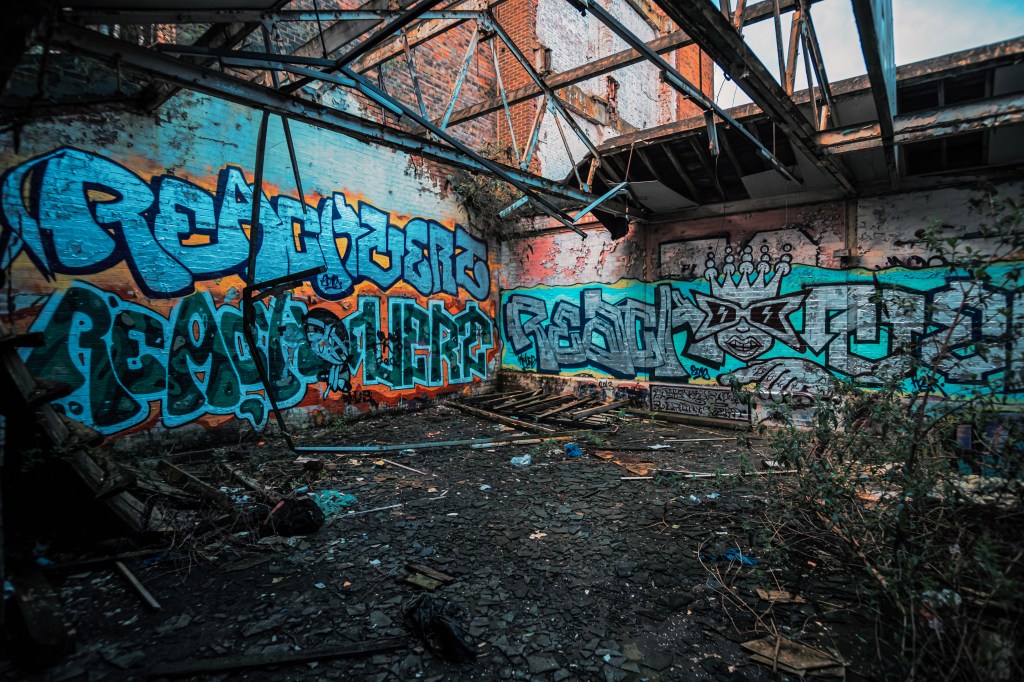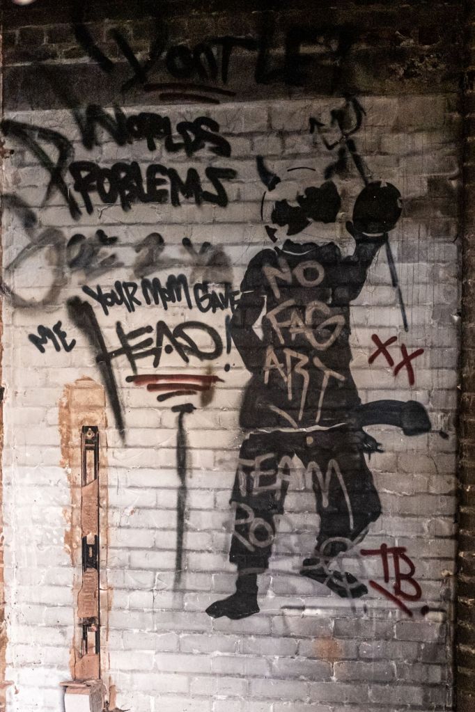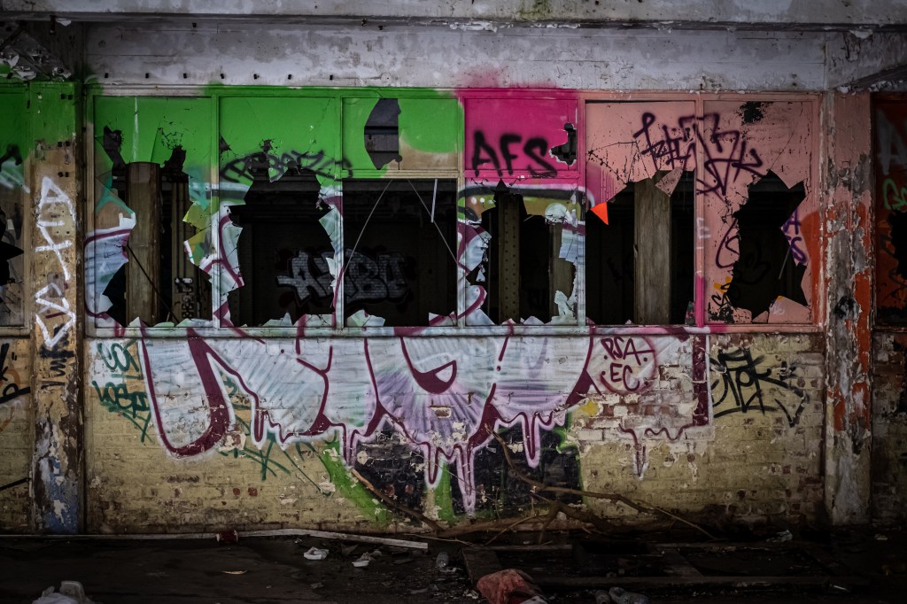 I won’t lie, this broken decayed aesthetic really appeals to me, it scratches a really weird itch, to see what life is like without people. I guess it’s that morbid fascination, imagining a post-apocalyptic world, but made real. Walking through the partly destroyed remains of buildings, examining the decay as nature reclaims these places feels like a sort of urban archaeology, finding and documenting the evidence of people left behind. I remember very vividly a visit to Skagen, north Denmark back in the early 90s, wandering along the coast there. My friend Magnus and I climbed up into these huge concrete gun emplacements that were slowly disappearing into the sands. They’re vast structures, weighing thousands of tons, once part of Nazi Germany’s ridiculous Atlantic Wall built to defend the Motherland. Inside it stank of urine, decades of morbid graffiti lined the walls. We smoked some weed and chilled, scrawling our names like so many others on the walls. So, urbexing, I kinda liked it even back then, but it’s only really recently that I’ve embraced it. And, yeah I guess it’s links into why I do what I do with the subways today.