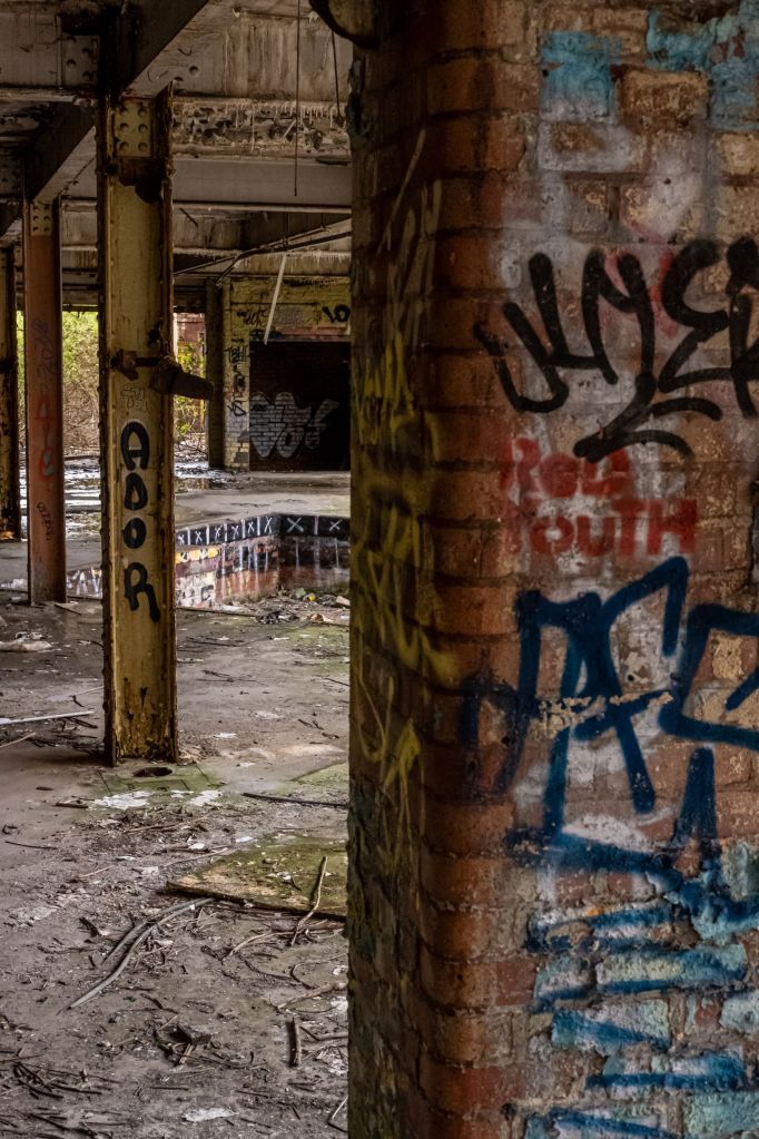 On this side of the complex a mirror image of the expanse of parquet and pillars, but it feels even more derelict, weedy goat willows stumble up the walls, broken branches fill the floor making navigation difficult. We keep our explore here to a minimum, there’s not much to see aside from the walls of graffiti. There’s a lot of that here, it’s good too, but oddly it doesn’t interest me. Usually I enjoy street art, but it’s not the thrill I’m seeking here, even though for others it’s why they invest so much time exploring these places, to find these treasured walls. I guess I’m more archaeologist than piss artist (but only just).
