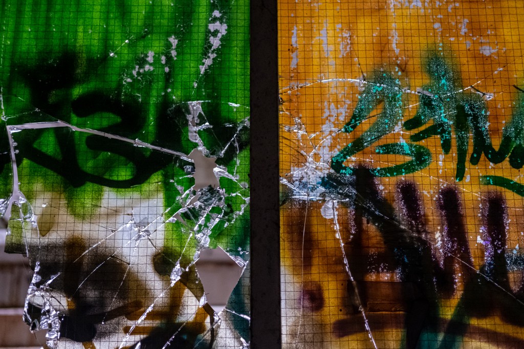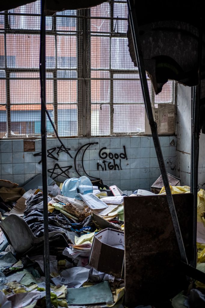 The steps are covered in debris, my torch flashes across dripping remains, papers, boxes of feminine hygiene products , needles, silver cylinders, the disregards and thrown. It’s crunchy, spongy and wet. Rounding a corner I find the remains of another fire door, torn in two jagged pieces on the floor, gaping like a dead mouth.