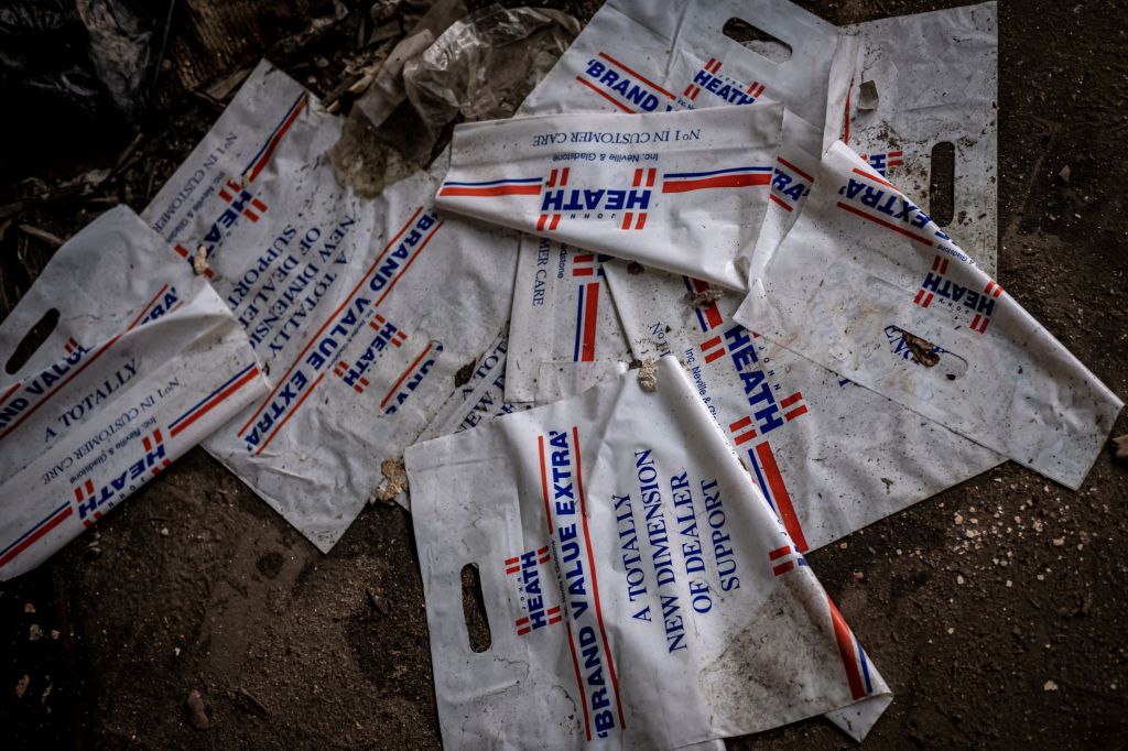 The room is so full of crap it resists any temptations to investigate potential spaces further on. I decide there aren’t any, the wall is an outside one, we can go no further. Examining this area a bit more closely I find a green porcelain toilet, sitting amidst the plaster rubble. I laugh out loud, grabbing some shots of it contrasted against a luridly blue wall of graff that looks like it hasn’t quite made up its mind yet. It works as an absurd composition. Strewn around are bits of old company paraphernalia, bags and invoice papers headed with ‘John Heath Ltd’, the company certainly went down the pan.