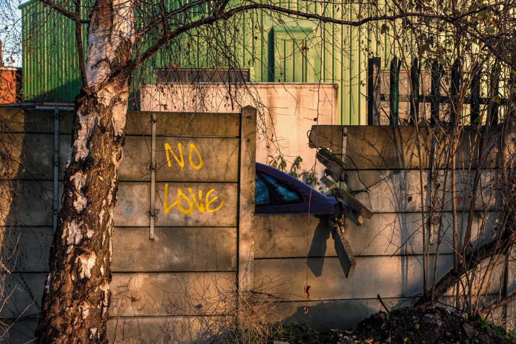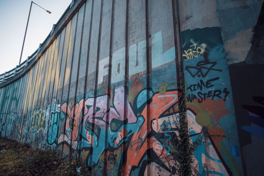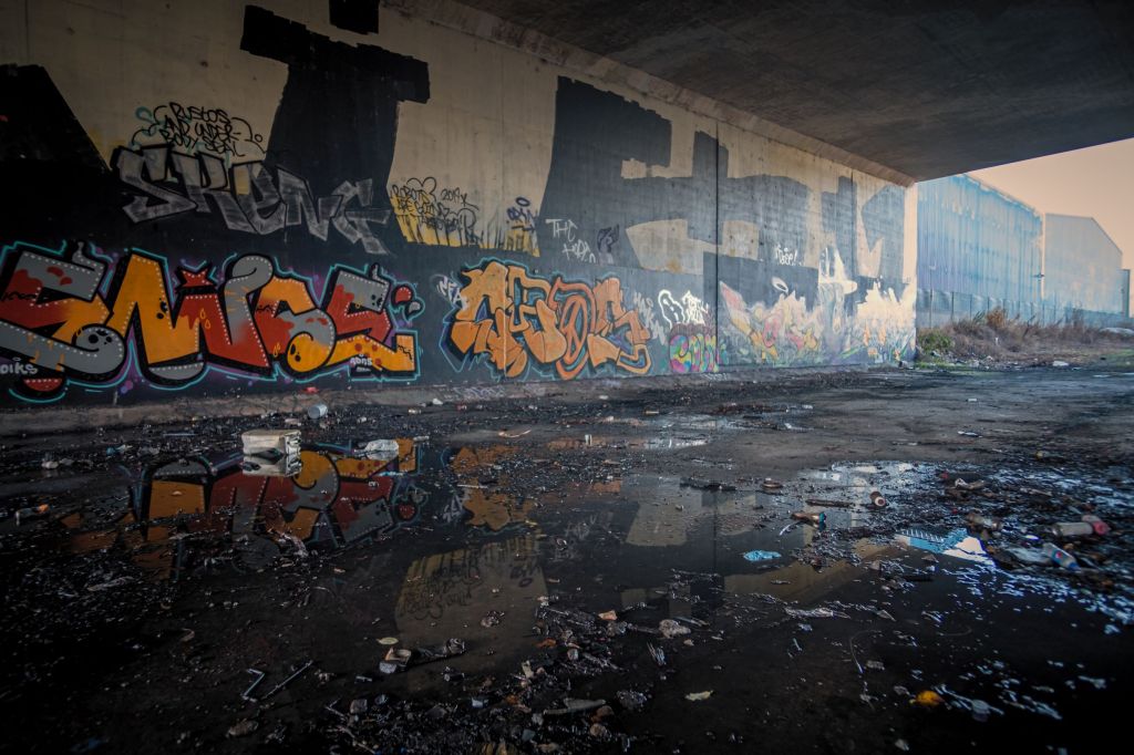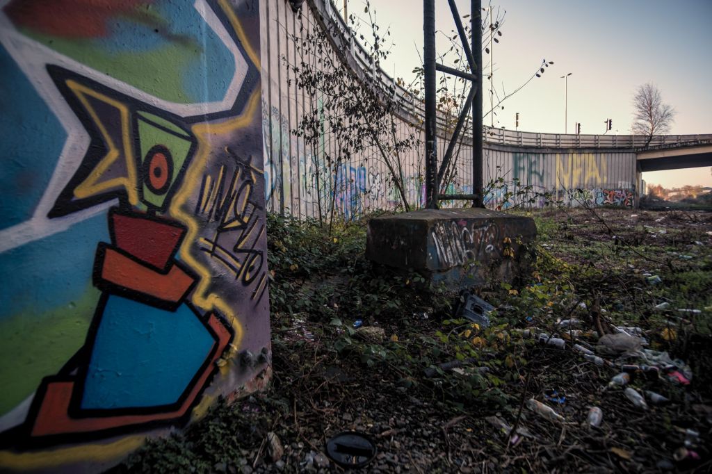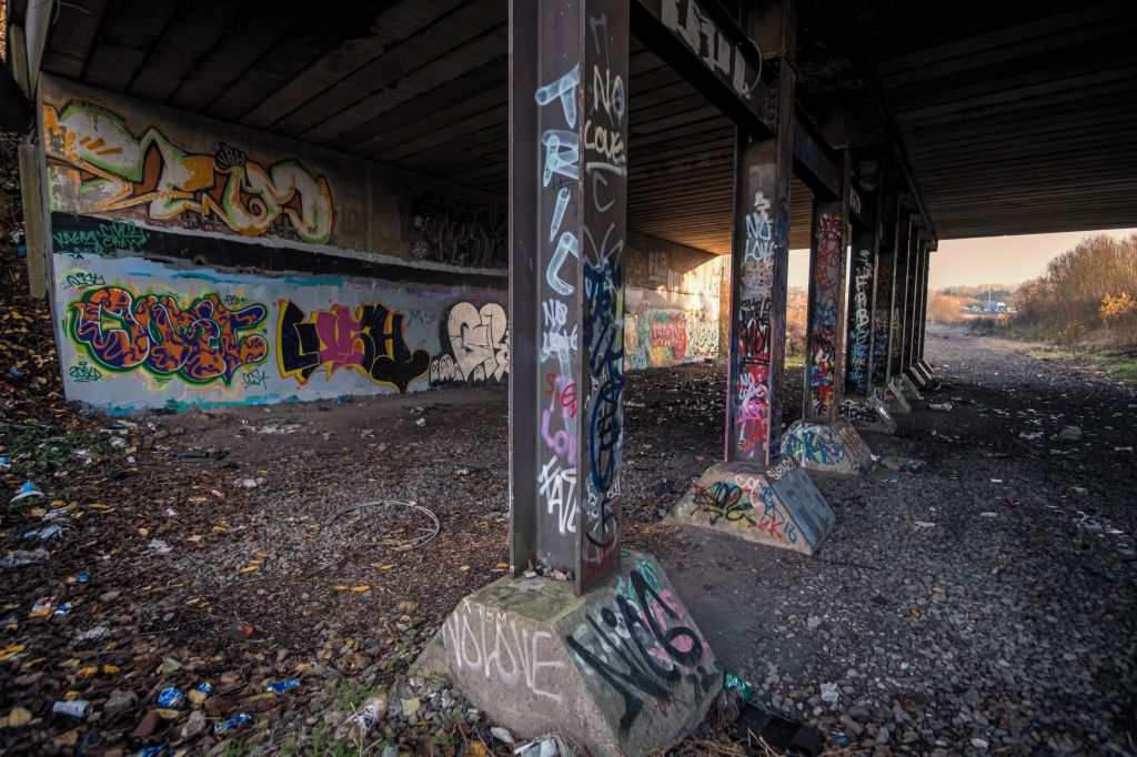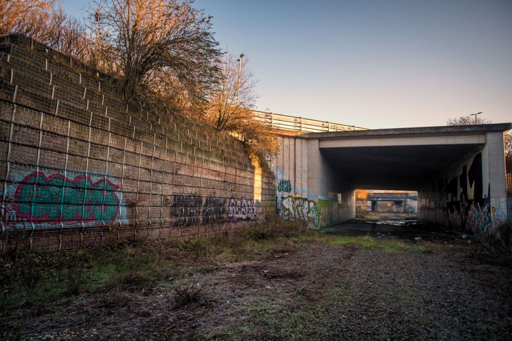 Up ahead a large rectangular concrete bridge looms, embraced by a vast embankment it’s innards coloured by graffiti and damp. Buddleia hang overhead as traffic gushes past as a river of noise. But down on the track-bed it’s us dancing amidst pools of fetid water and worse. Used cafe cups litter the floor thrown over by the mindless many, caught in the eddies below, mixed up with used aerosols and empty needles.
