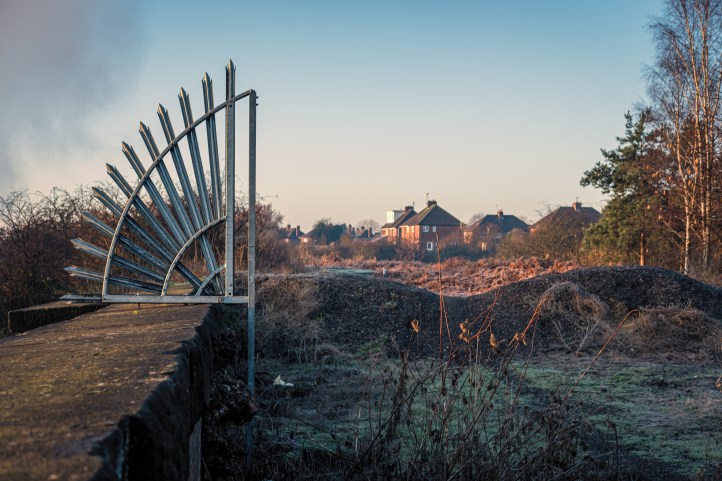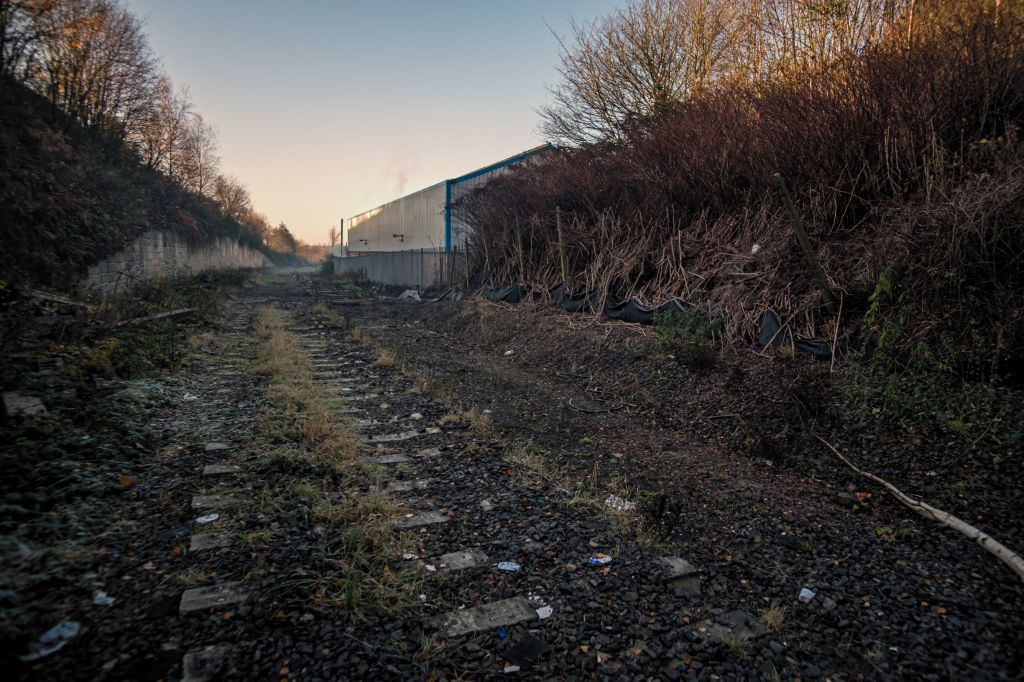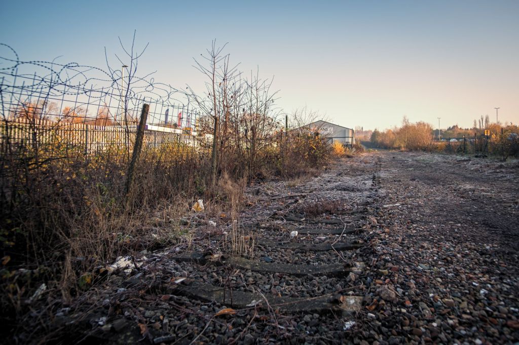 Chris was nipping about, lining up and popping pix, loving the sunshine as it lit up the blandscape, his breath steaming out like an old school loco. We grinned at each other and started walking along, traipsing across the littered aggregates that form the base of the railway line. Most of the tracks here have gone, but only recently it seems, probably for illicit scrap whilst many of the concrete sleepers remain.