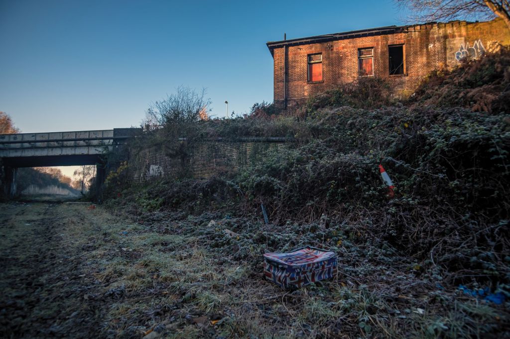 The line dips again below all acknowledgement, as the roads and walls of industry enclose us once more. The tracks lead our eyes and feet as the hills of Dudley rise up around us. Here it really feels like we’re on the railway as another utilitarian bridge looms above us. Just beyond and to the right is a singular sealed building balancing atop the embankment. This is Blowers Green Station house, bathed in the morning sunshine. It’s forlornly lovely, despite its blanked windows and tumbledown walls. A Union Jack suitcase sits on the track-bed beneath, lost or found, as if in homage to this dead place. Louis Vuitton never travelled on the South Staffs railway.