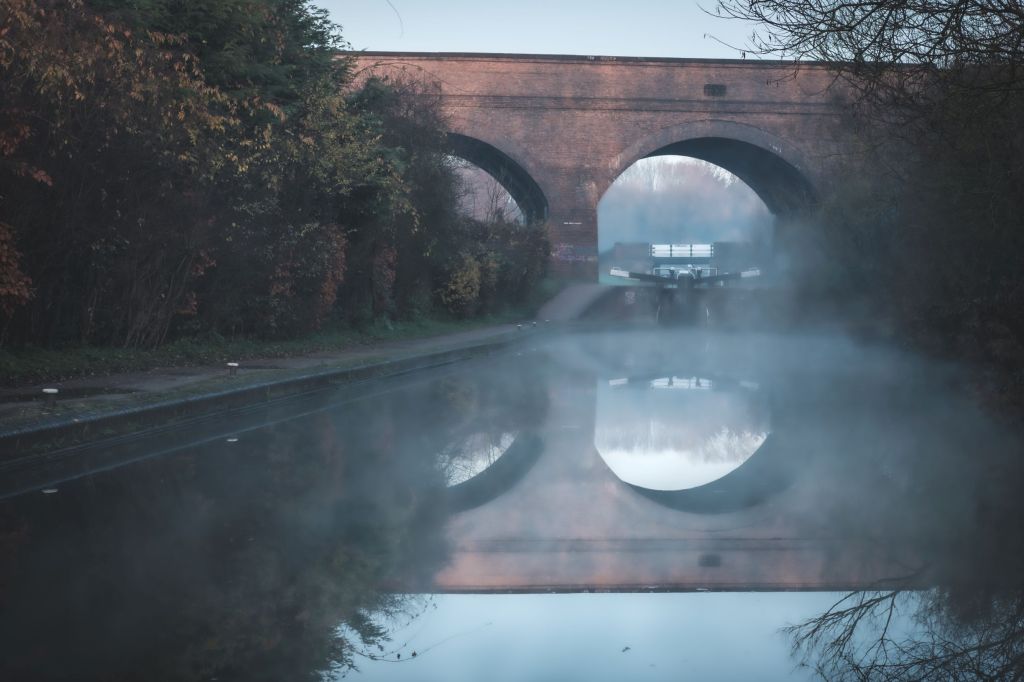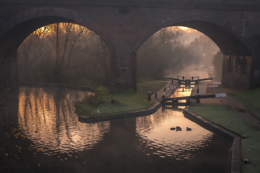 The looming viaduct above us was the intended start point for our walk, but being photographers, a glorious morning mist got us all breathless and excited. Wandering down to the next set of locks allowed us to take in the lovely symmetry of its reflections as the sun rose behind us, bathing it in a soft glow. Originally the viaduct was built from wood, in a trestle style traversing the basin over the Parkhead locks. It was constructed to carry the Oxford, Worcester and Wolverhampton Railway, its works overseen by the great builder himself, Isembard Kingdom Brunel, and completed in 1850. However, its construction and use was persistently troubled by the groundworks beneath, all was not well with the viaduct. The soft Dudley ground and subsidence from mining beneath was causing the structure to sink!