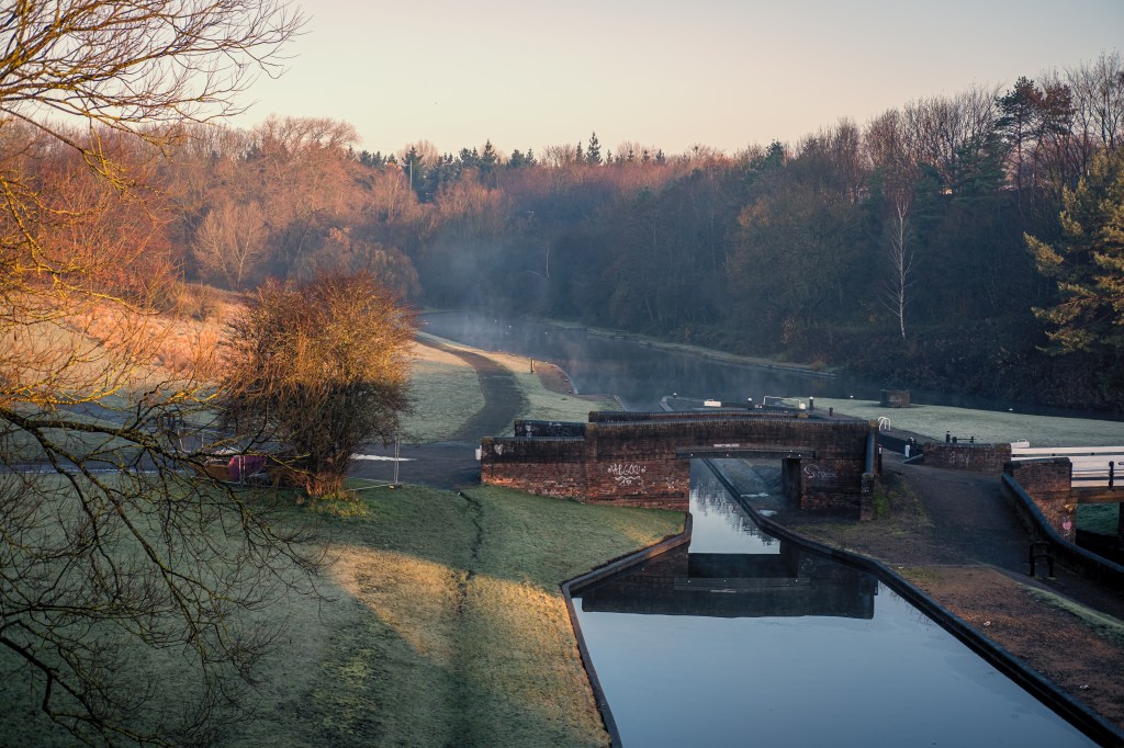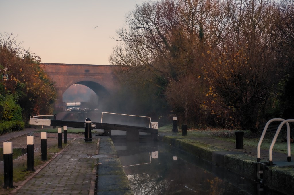 After parking up, Chris led us out to a leafy path that dipped down into a wide canal basin straddled at its end by a large brick viaduct. The sun had barely risen over the vast arches of the viaduct, the frigid canal wreathed in a deep layer of mist, such a delight to see! We had the place to ourselves, although the icy tendrils of the mist were fast disappearing. We had a brief walk under the viaduct, following the canal through the locks beneath.